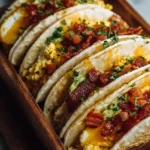 Delightful breakfast tacos filled with crispy bacon, seasoned potatoes, fluffy scrambled eggs, and melted Monterey Jack cheese, perfect for busy mornings or family brunch.