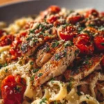 Bruschetta Chicken Pasta brings together the best of two worlds: the classic Italian bruschetta and a hearty pasta dish. This recipe combines juicy grilled chicken, fresh tomatoes, aromatic garlic, and fragrant basil all tossed together with pasta and topped with parmesan cheese. Not only is it packed with flavors, but it also offers a colorful presentation that’s sure to impress family and friends. Whether you’re in a rush or planning a dinner party, this pasta recipe is quick, satisfying, and delicious.