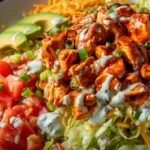 - Top It Off: Add shredded lettuce and halved cherry tomatoes to each bowl. Sprinkle with cheddar cheese, drizzle ranch or blue cheese dressing, and garnish with sliced green onions. If you’re feeling fancy, top with sliced avocado for additional creaminess.