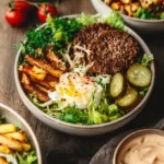 Leftover burger bowls can be stored in an airtight container in the refrigerator for up to three days. To reheat, simply microwave gently until heated through or warm in a skillet. Avoid reheating the lettuce and sauces separately to maintain their texture. For longer storage, you can freeze the cooked beef and potatoes, but assemble the bowls fresh before serving for the best experience.