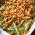 A nostalgic favorite green bean casserole featuring creamy mushroom sauce and crispy onions, perfect for holidays and family gatherings.