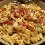 A comforting dish combining the earthy flavors of bacon and ranch with chicken and pasta, perfect for weeknights or cozy dinners.
