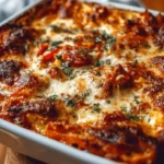 A comforting Chicken Parmesan Casserole combining juicy shredded chicken, marinara sauce, tender pasta, and gooey cheese for a delightful weeknight meal.