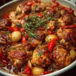 A vibrant dish of tender chicken thighs, spicy sausage, and colorful bell peppers, infused with tangy vinegar and aromatic garlic.