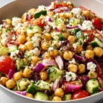 A vibrant and refreshing salad combining tender chickpeas, crisp vegetables, and creamy feta cheese, perfect for summer picnics and light lunches.