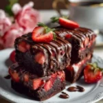 Decadent brownies infused with chocolate and fresh strawberries, topped with a luxurious chocolate ganache.