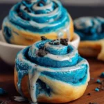 Delightfully vibrant blue cinnamon rolls filled with chocolate sandwich cookies and topped with a creamy frosting, perfect for any occasion.