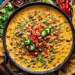 An indulgent, creamy dip combining ground beef with cheese, tomatoes, and black beans, perfect for gatherings and game nights.