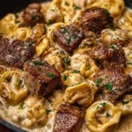 A comforting blend of tender steak and cheesy tortellini in a creamy garlic sauce, perfect for weeknight dinners or special occasions.
