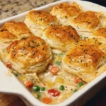 A warm and comforting chicken pot pie casserole combining tender chicken, vibrant vegetables, and a creamy sauce, topped with a golden, flaky crust.