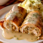 Delightful turkey roll-ups filled with savory stuffing and smothered in creamy gravy, perfect for busy weeknights or holiday gatherings.