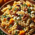 A vibrant pasta salad featuring roasted butternut squash, dried cranberries, and a tangy dressing, perfect for autumn gatherings.