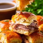 Warm, gooey French dip sliders filled with roast beef, caramelized onions, and melted Swiss cheese, served with a savory au jus for dipping.