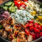 Vibrant and nutritious Greek Chicken Bowls with grilled chicken, fresh vegetables, creamy feta, and tzatziki.