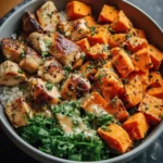 - Assemble the bowls: Start with a layer of roasted sweet potatoes, add sliced chicken, top with sautéed veggies, and garnish with fresh herbs.