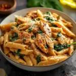 5. Combine and Finish: Return the cooked chicken to the skillet and add pasta and baby spinach. Toss to coat evenly in the sauce, heating until the spinach wilts.