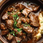 A hearty dish featuring tender chunks of beef, perfect for weeknight dinners and gatherings served over creamy mashed potatoes.