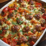 A delightful dish combining spicy Italian sausage, colorful bell peppers, and zesty herbs in a hearty casserole, perfect for family dinners.