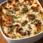 A rich and creamy casserole combining shredded chicken, garlic, and mushrooms, perfect for a cozy meal.