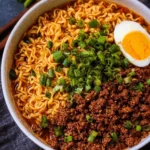 This cozy bowl brings big Korean-inspired flavor with simple pantry items and a short cook time. It tastes bold and rich, yet it uses everyday ingredients you likely already have. Ground beef adds hearty bite. Gochujang brings heat and a little sweetness. Soy sauce adds depth. Sesame oil makes everything smell toasty and nutty. Garlic and green onions give a fresh finish. Toss it all with springy ramen noodles and you get a complete meal in minutes.