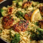 A comforting one-pan meal with tender chicken, zesty lemon, vibrant broccoli, and creamy orzo, perfect for busy weeknights or cozy family dinners.