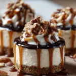 Indulge in rich and creamy no-bake mini cheesecakes layered with a luscious cream cheese mixture, drizzled with caramel and chocolate, and topped with crunchy pecans.