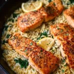 This one-skillet salmon with lemon orzo is a feast for the senses. It highlights the tenderness of perfectly seared salmon and the comforting creaminess of orzo, all while bursting with flavors from garlic, onion, and just a hint of lemon. This dish is special not only for its taste but also for its convenience.