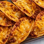 - On a large baking sheet, arrange the taco shells. Fill each shell with the meat mixture, then top generously with cheese.