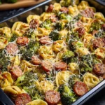 A hearty and satisfying one-pan meal featuring broccoli, chicken sausage, and cheesy tortellini, perfect for family dinners.