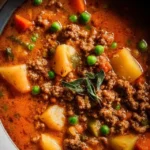 A comforting ground beef stew filled with fresh vegetables and rich broth, perfect for family dinners.