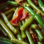 A comforting side dish of tender green beans slow-cooked with crispy bacon and savory broth.