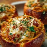 Delightful garlic bread bowls generously stuffed with tender spaghetti coated in your favorite pasta sauce, all baked to perfection.