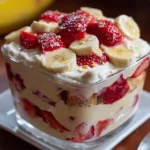 A delightful dessert featuring layers of strawberries, bananas, and creamy pudding, perfect for summer gatherings or a nostalgic treat.