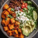 Assemble the Bowl: Take your roasted sweet potatoes and divide them into serving bowls. Top with the seasoned beef (or alternative), pico de gallo, guacamole, and a dollop of sour cream. Garnish with fresh cilantro and lime wedges, or crumbled cheese if you wish.